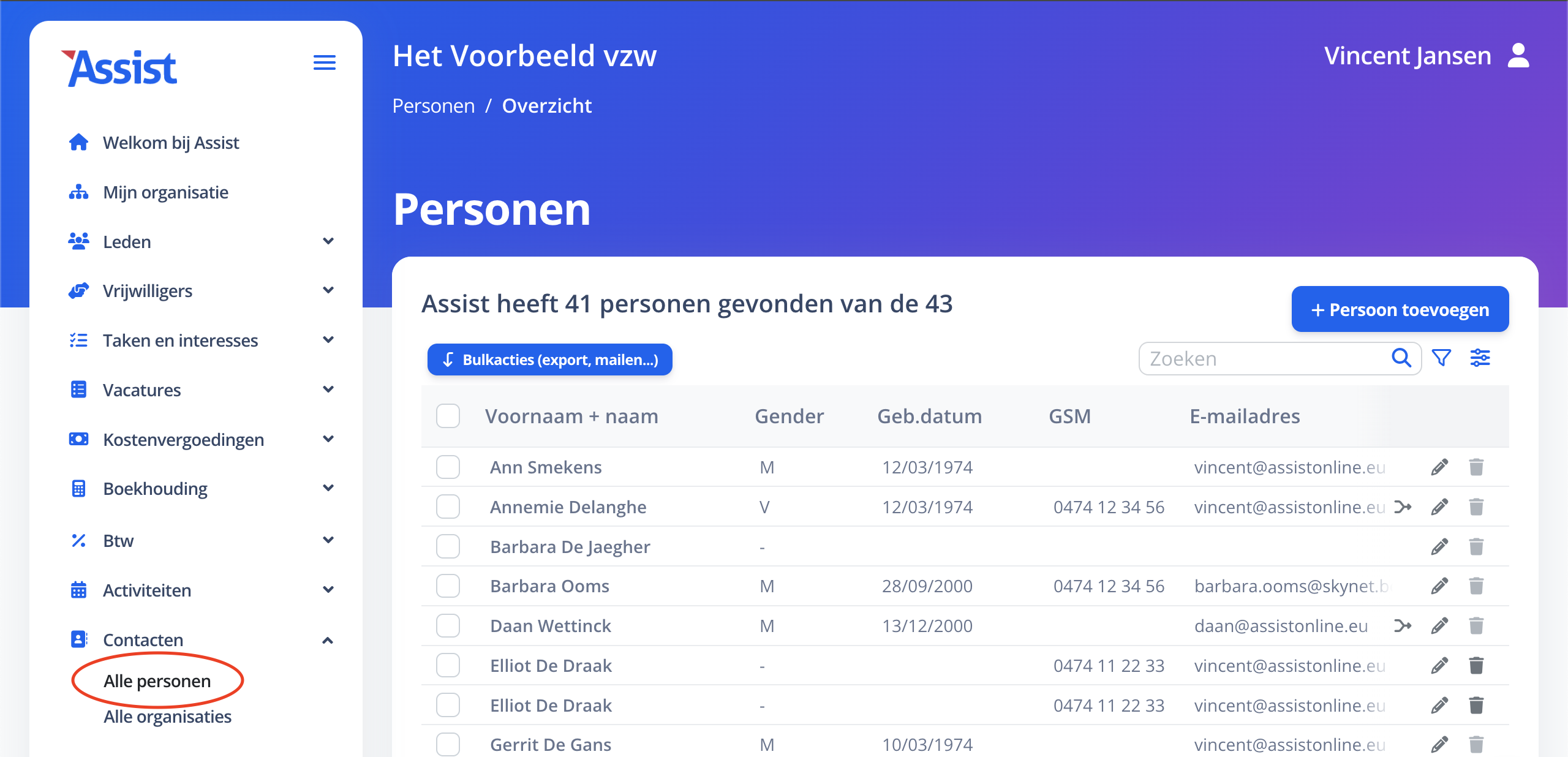In de rubriek 'Contacten' >> 'Alle personen' (in de nieuwe Assist) of 'Personen' (in de oude Assist) worden alle personen opgelijst die op één of andere manier betrokken zijn bij de vereniging. Zoek je 'iemand', dan kan je deze altijd terugvinden via deze rubriek. De twee overige rubrieken 'Leden' en 'Vrijwilligers' zijn een filter van deze grote groep van personen.