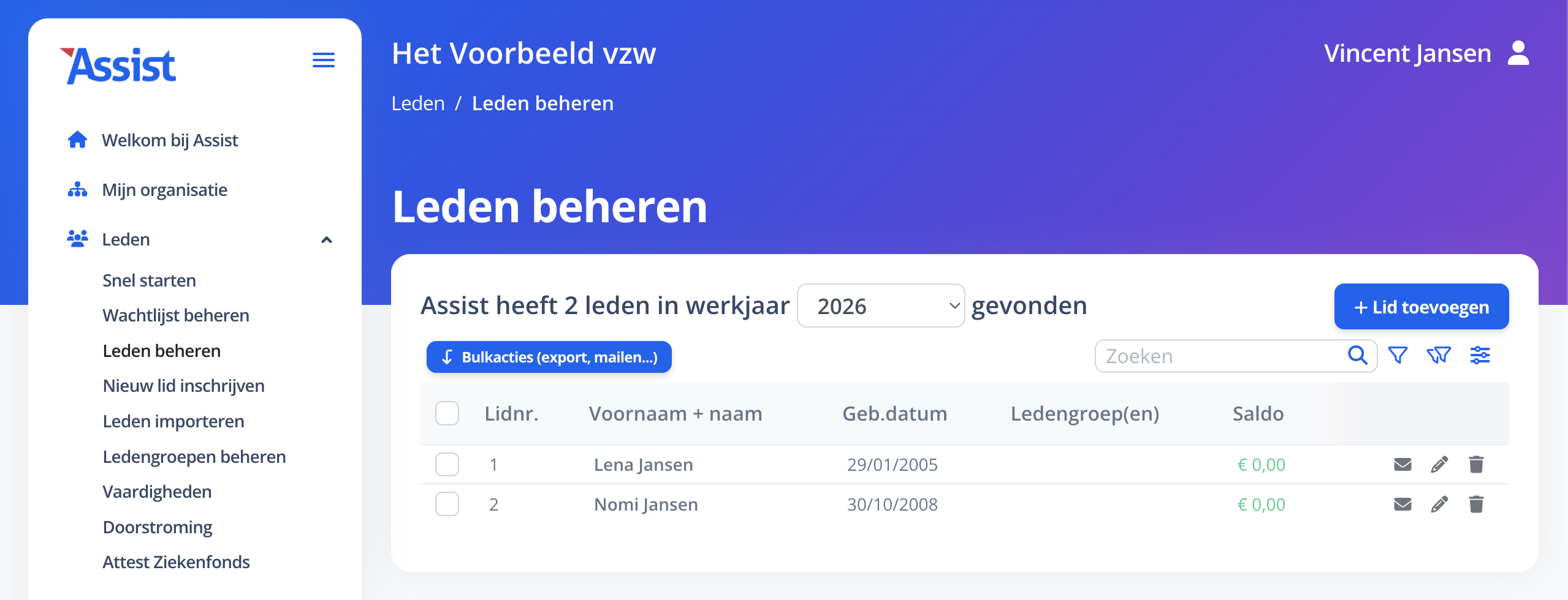 In de rubriek 'Leden' >> 'Leden beheren' (nieuwe Assist) en 'Leden' (oude Assist) vind je dus enkel die personen die in een bepaald werkjaar 'toegetreden lid' zijn van de vereniging. Dit zijn niét de leden van de Algemene Vergadering, maar wel die leden die deelnemen aan de activiteiten van de vereniging. Je kan deze leden indelen in meerdere ledengroepen en beheren per kalenderjaar of per zelfgekozen werkjaar.
