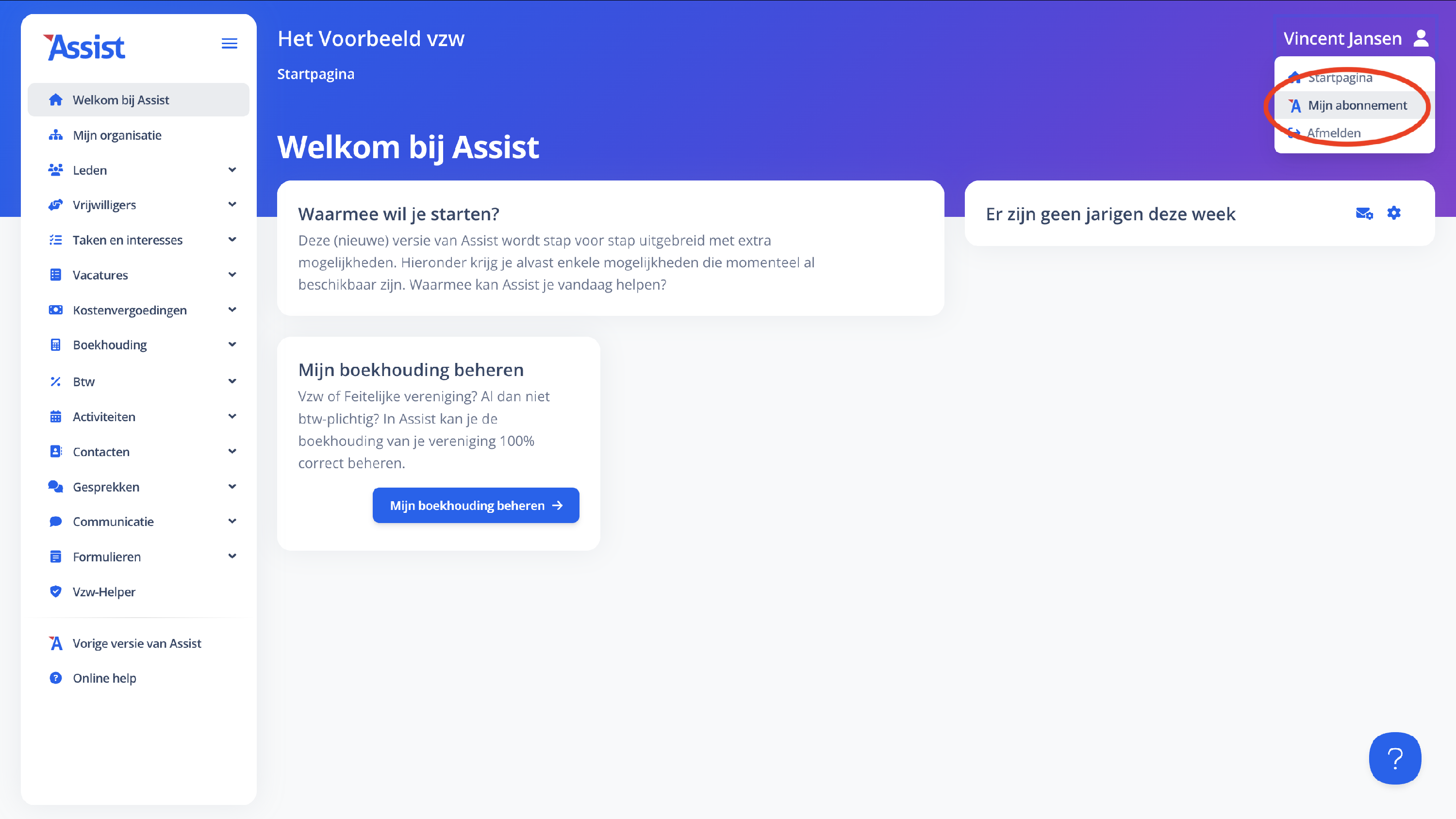 Werk je al in de nieuwe Assist, dan klik je rechts bovenaan op het witte mannetje en vervolgens op 'Mijn abonnement'
